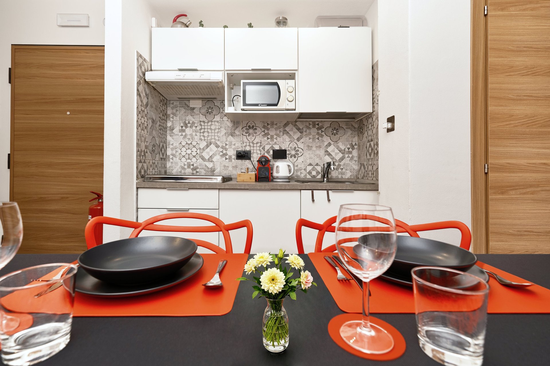 Gli ospiti possono usufruire anche di una luminosa sala, arricchita da un angolo cottura completamente attrezzato con frigorifero, piano cottura, microonde, bollitore e macchina per il caffè espresso.