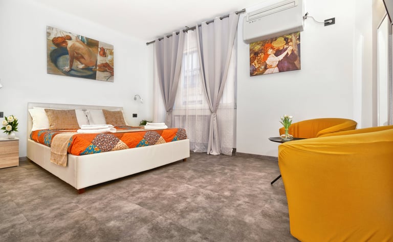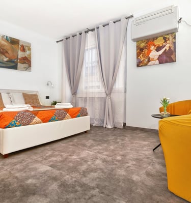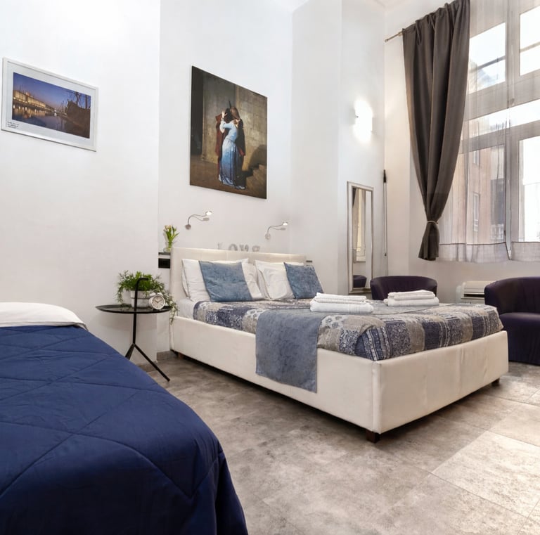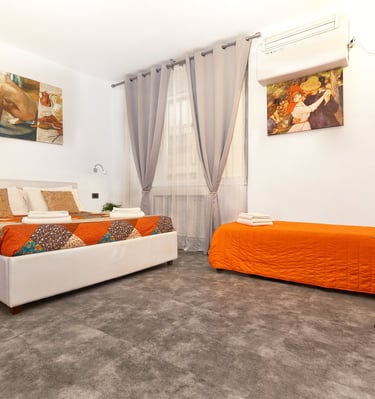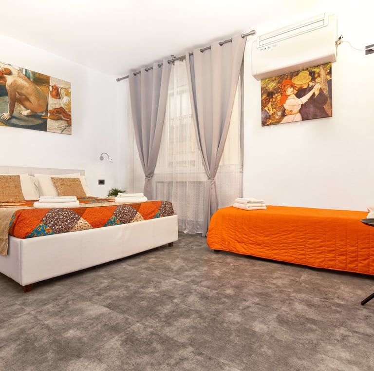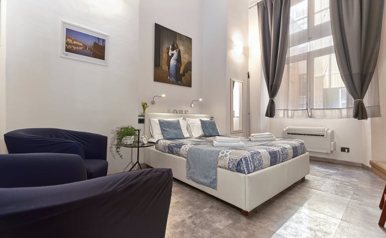 La camera dispone di un letto matrimoniale, con possibilita di aggiunta di un terzo letto singolo, di bagno privato, aria condizionata, riscaldamento e comfort moderni, ed è ideale per chi cerca un soggiorno confortevole e suggestivo.