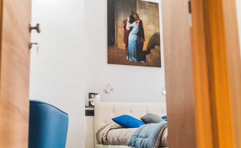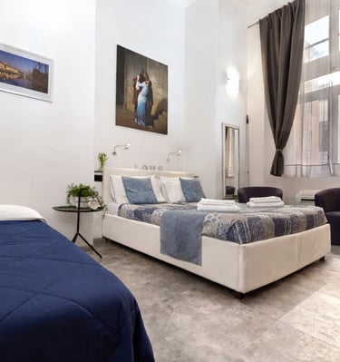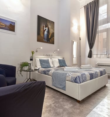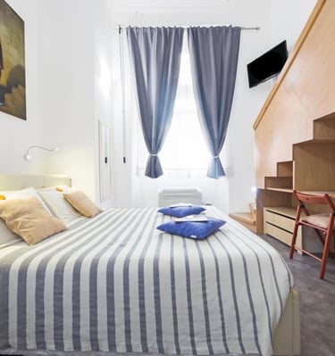 La camera, dotata di letto matrimoniale, con la possibilitá di aggiungere un terzo letto singolo, ha il bagno privato ed é ideale per chi cerca comfort, storia e fascino tipico del centro storico.